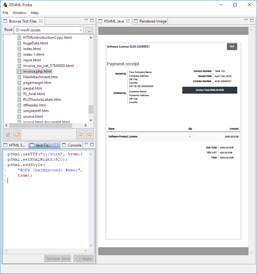 • In the examples the generated PDF is written to a file, defined with -out parameter. That makes possible to use STDOUT for debug output (-debug parameter).